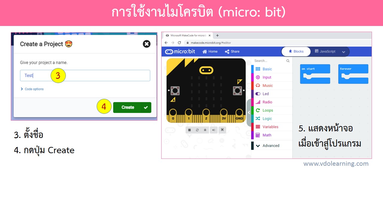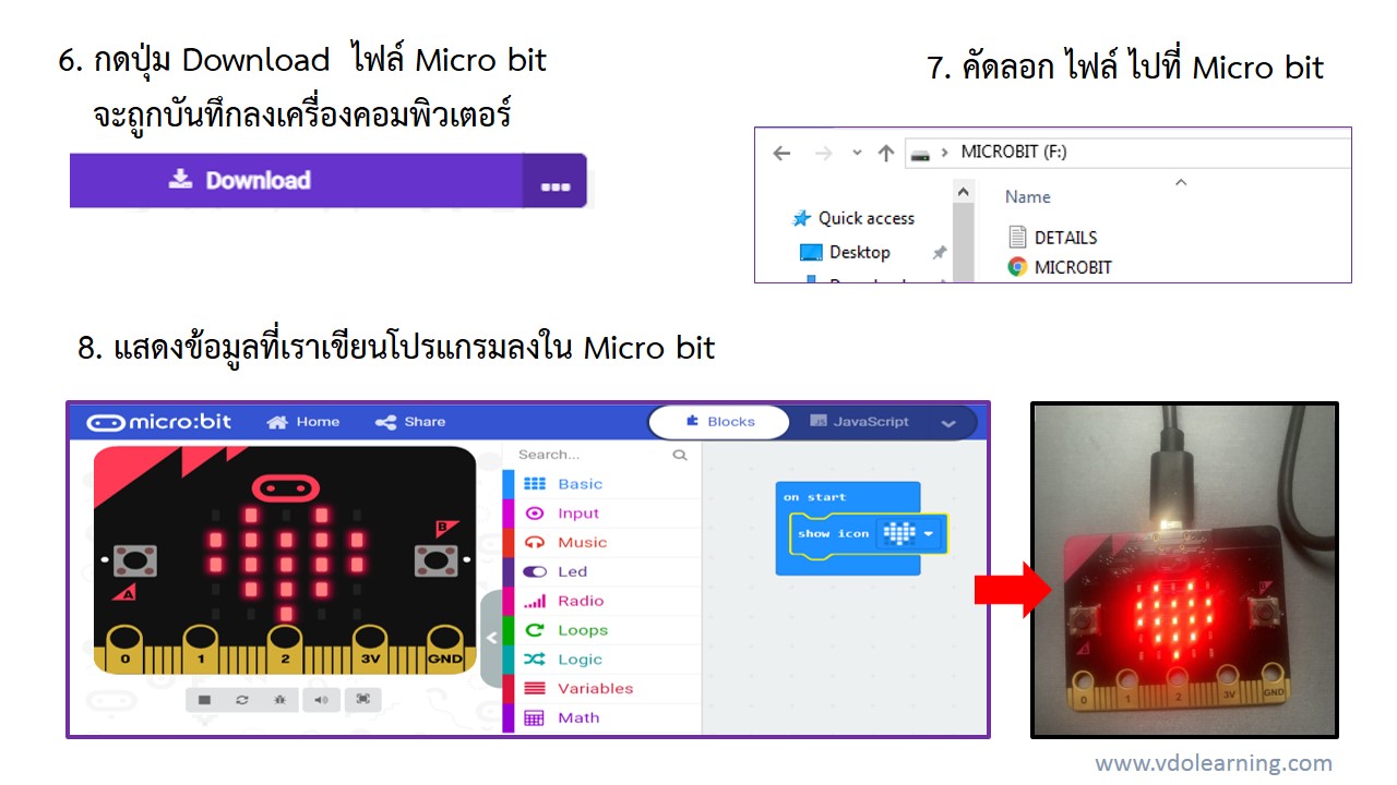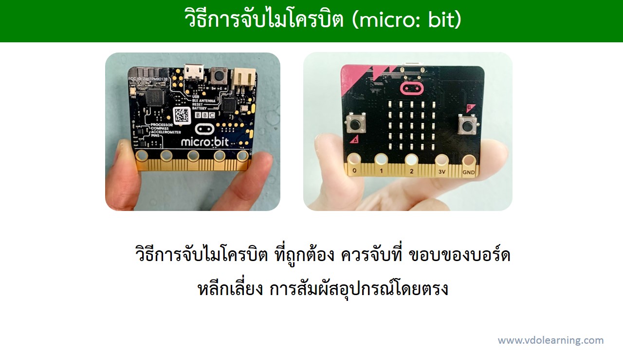 การใช้งานไมโครบิตเบื้องต้นนี้ กล่าวถึงวิธีการจับบอร์ดไมโครบิตที่ถูกต้องเพื่อถนอมการใช้งาน และการใช้โปรแกรแกรมไมโครบิตเบื้องต้น รายละเอียดมีดังนี้