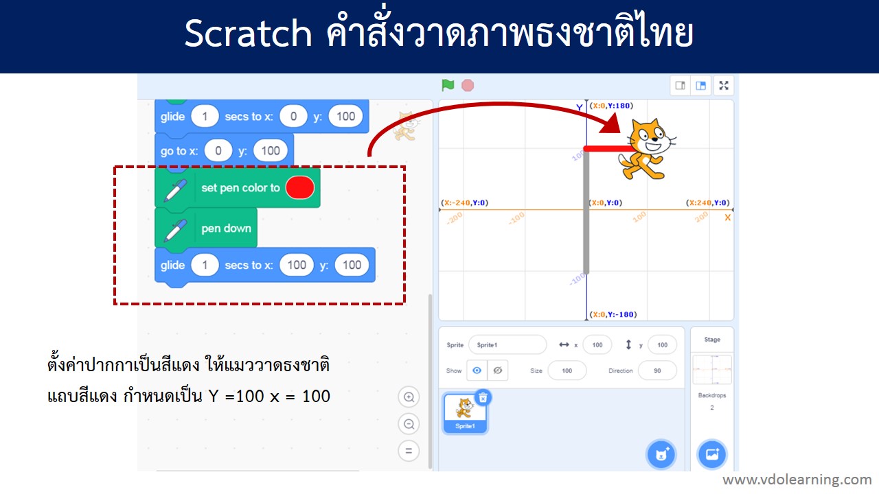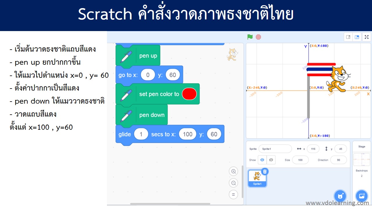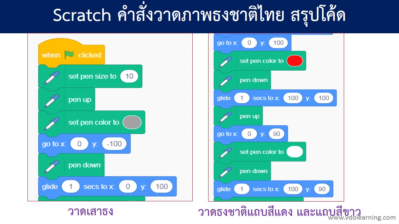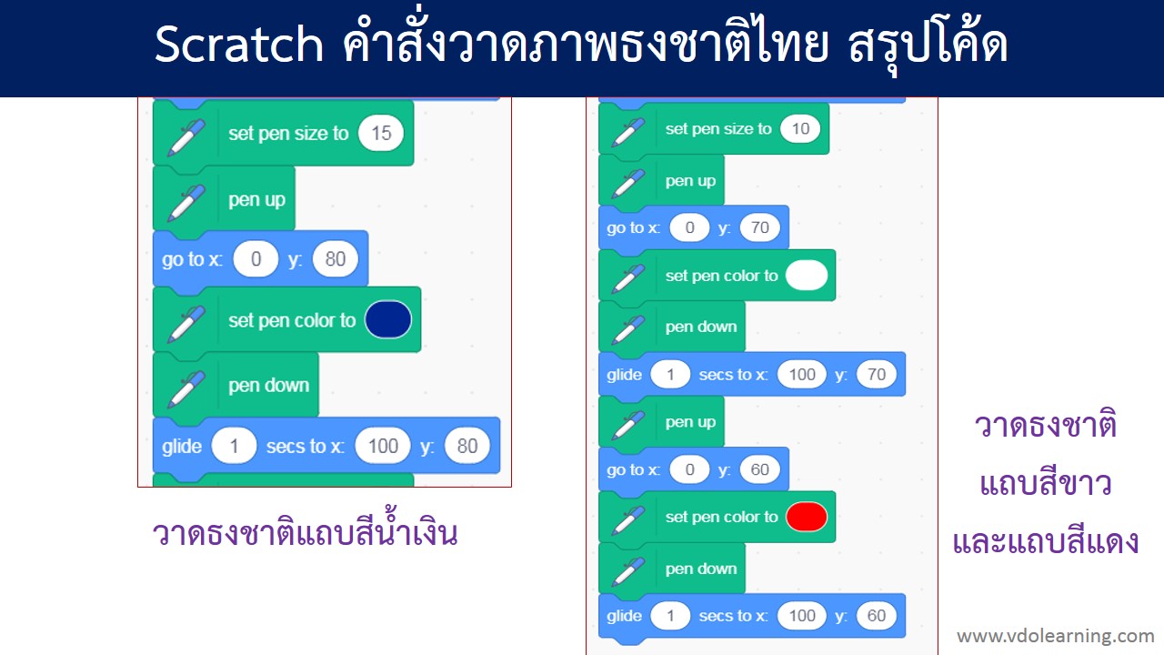 Scratch วาดรูปธงชาติไทย เป็นเนื้อหาที่แนะนำให้นักเรียนใช้บล็อกคำสั่งต่าง ๆ ในโปรแกรม เพื่อสร้างให้ตัวละครสามารถวาดรูปได้ ซึ่งเนื้อหานี้จะเป็นการแนะนำการเขียนโค้ด หรือใช้บล็อกคำสั่งที่สั่งให้ตัวละครวาดรูปธงชาติไทย และตัวอย่างนี้อยู่ในหนังสือเรียนวิชาเทคโนโลยี(วิทยาการคำนวณ)ชั้น ป.4 ของ สสวท. ชื่อเรื่อง ปักธงชาติไทย รายละเอียดของบล็อกคำสั่งวาดรูปธงชาติไทย มีดังนี้