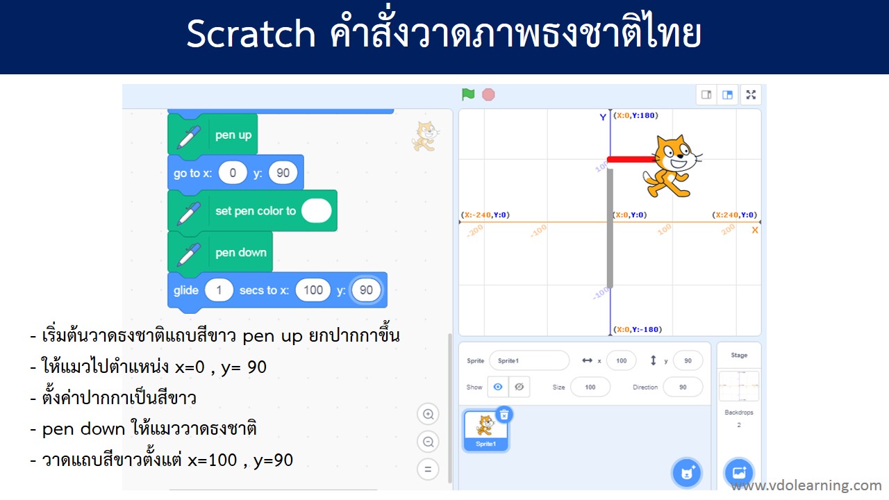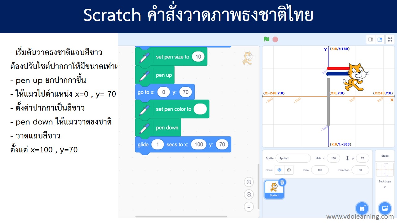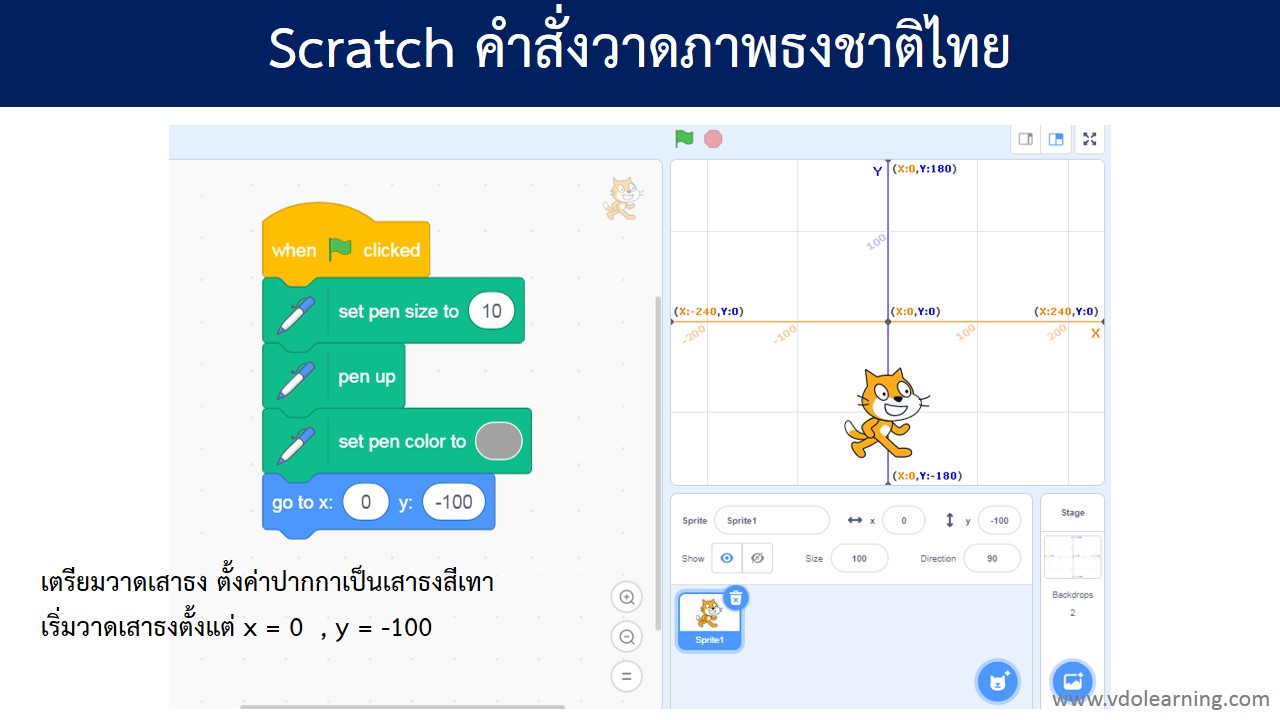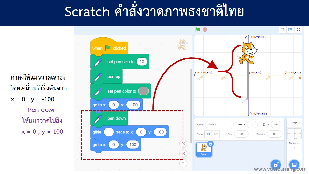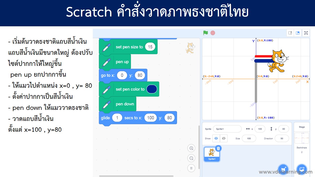 Scratch วาดรูปธงชาติไทย เป็นเนื้อหาที่แนะนำให้นักเรียนใช้บล็อกคำสั่งต่าง ๆ ในโปรแกรม เพื่อสร้างให้ตัวละครสามารถวาดรูปได้ ซึ่งเนื้อหานี้จะเป็นการแนะนำการเขียนโค้ด หรือใช้บล็อกคำสั่งที่สั่งให้ตัวละครวาดรูปธงชาติไทย และตัวอย่างนี้อยู่ในหนังสือเรียนวิชาเทคโนโลยี(วิทยาการคำนวณ)ชั้น ป.4 ของ สสวท. ชื่อเรื่อง ปักธงชาติไทย รายละเอียดของบล็อกคำสั่งวาดรูปธงชาติไทย มีดังนี้