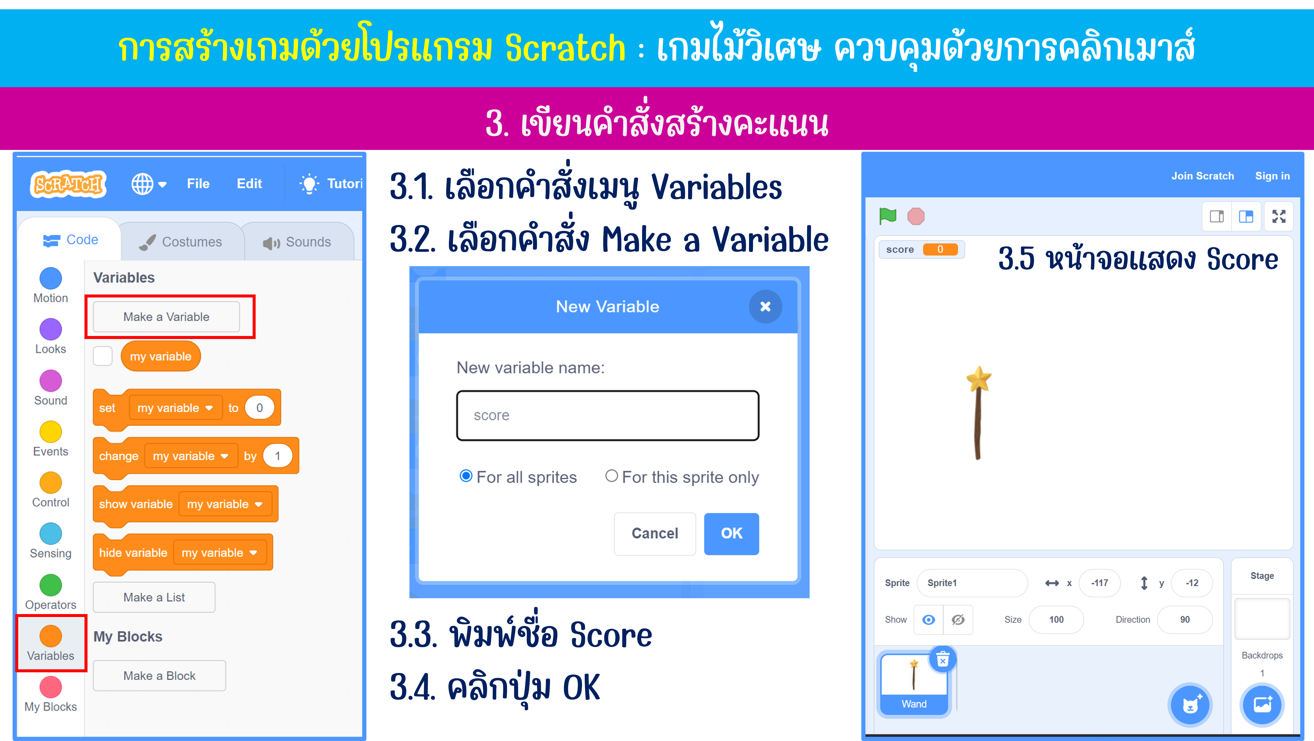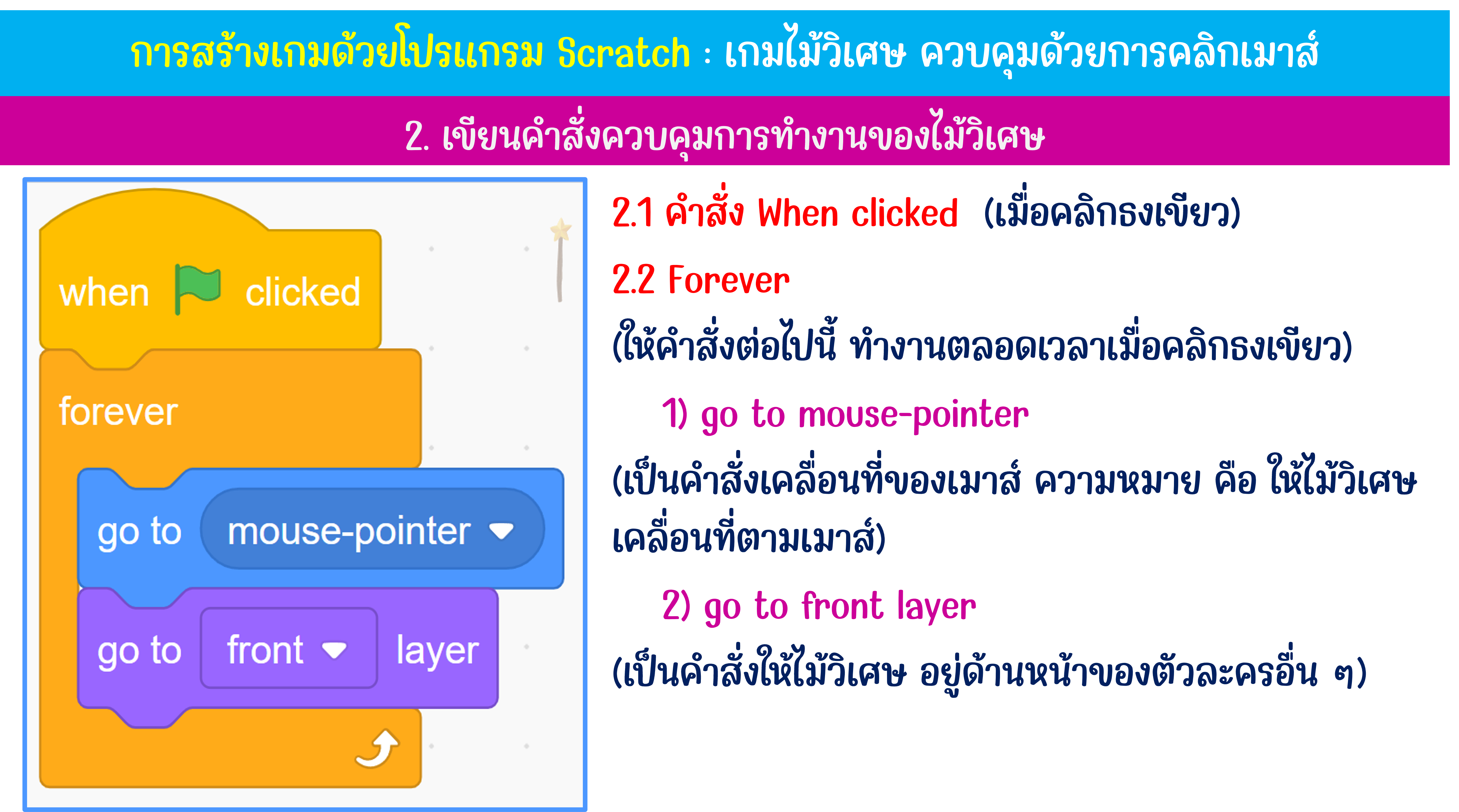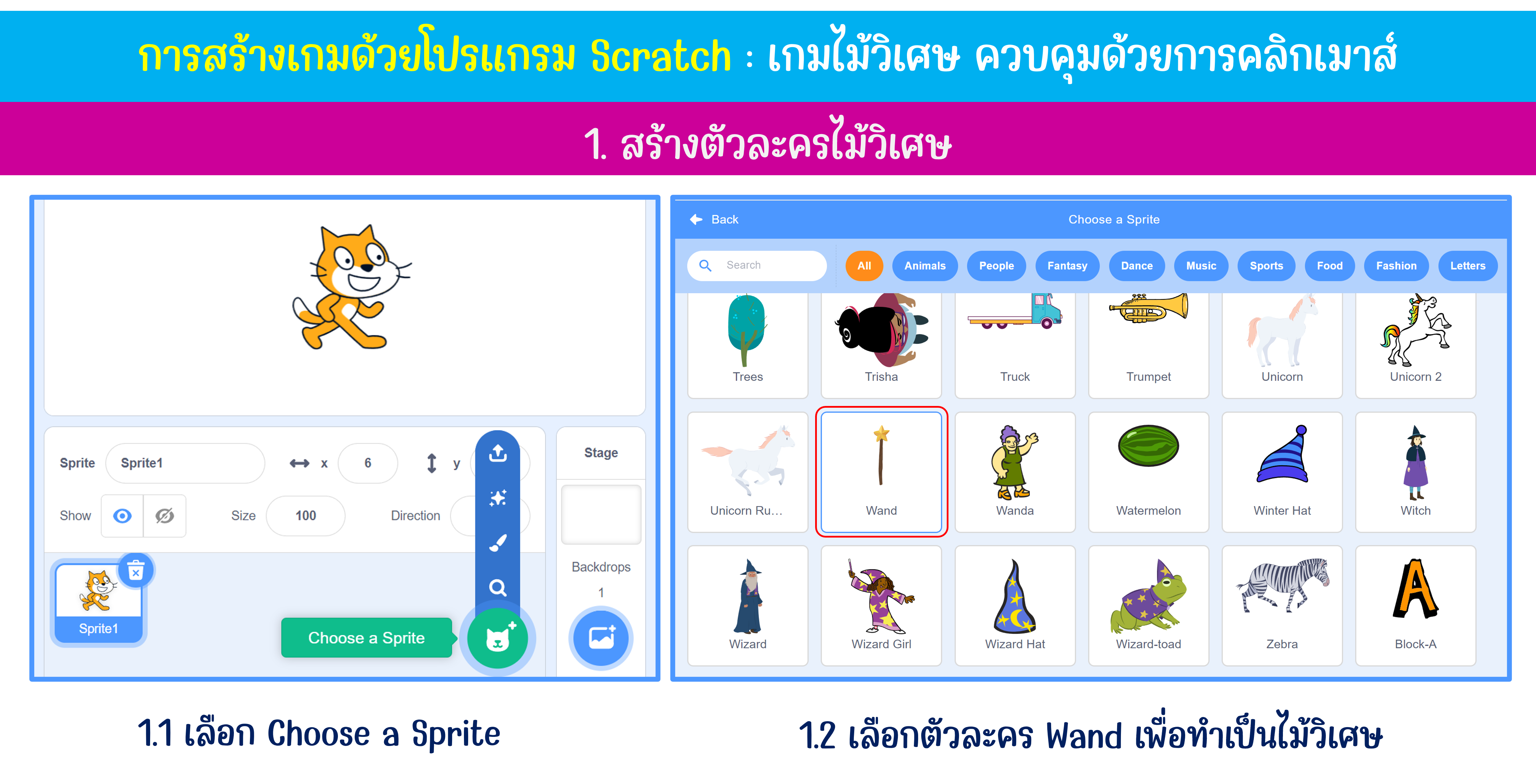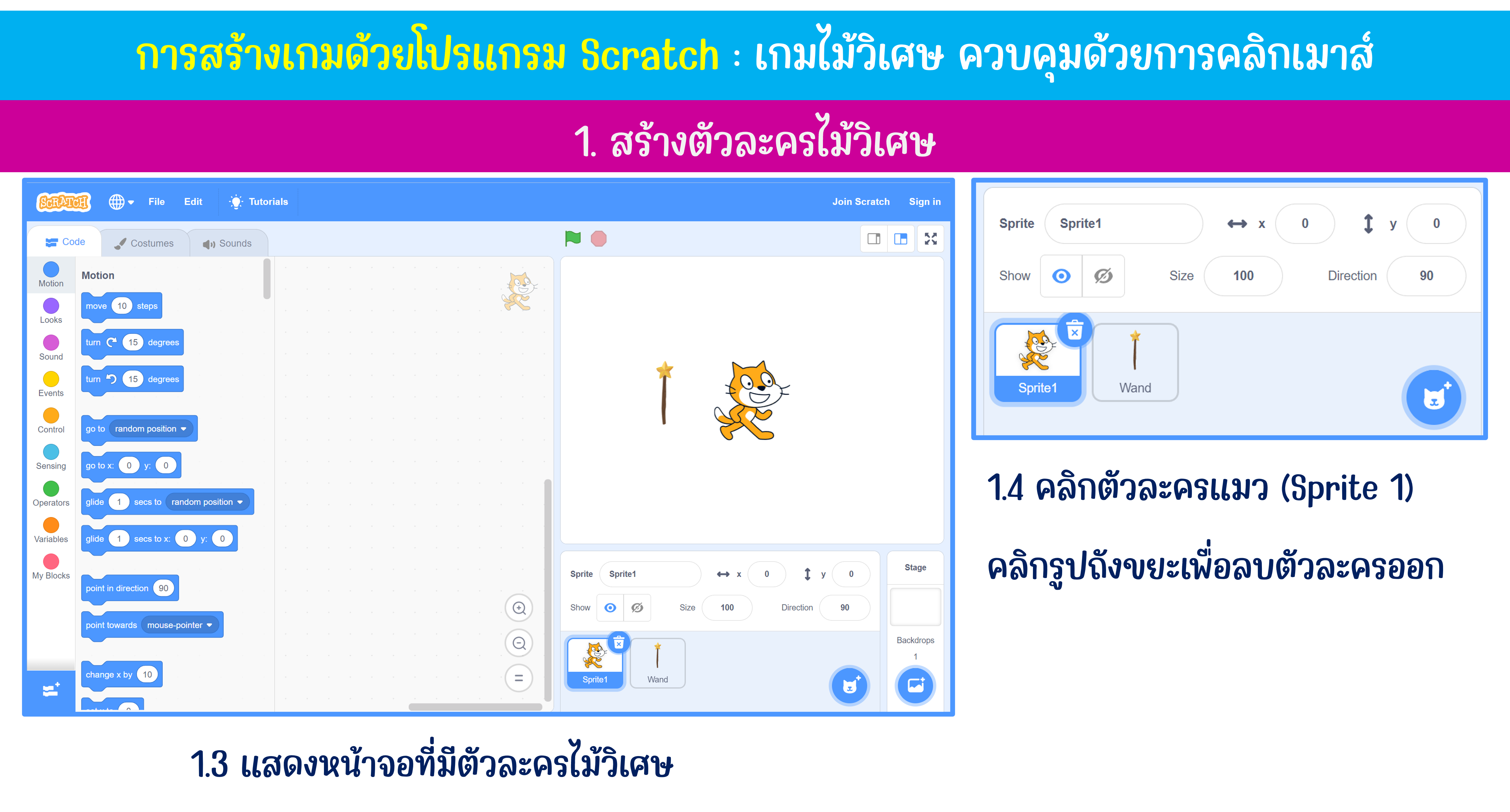 การสร้างเกมด้วยโปรแกรม Scratch : เกมไม้วิเศษ ควบคุมด้วยการคลิกเมาส์ ลักษณะของเกมคือ ให้ตัวละครเคลื่อนที่ด้วยเมาส์ เมื่อนำเมาส์ซึ้งเป็นไม้วิเศษไปแตะที่ตัวละครจะทำให้ได้คะแนน 1 คะแนน และตัวละครนั้นจะหายไป มีขั้นตอนการทำงาน ดังนี้