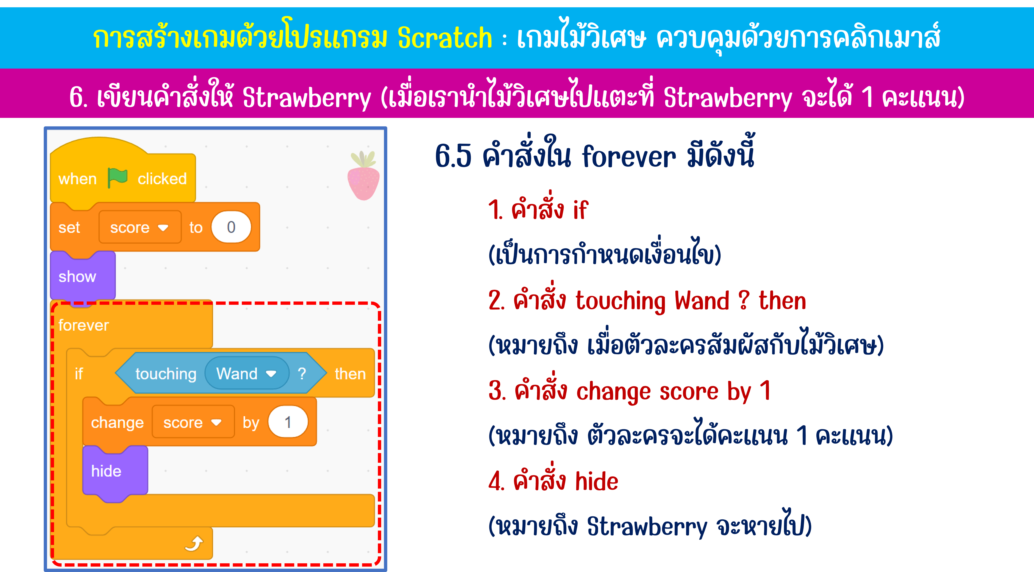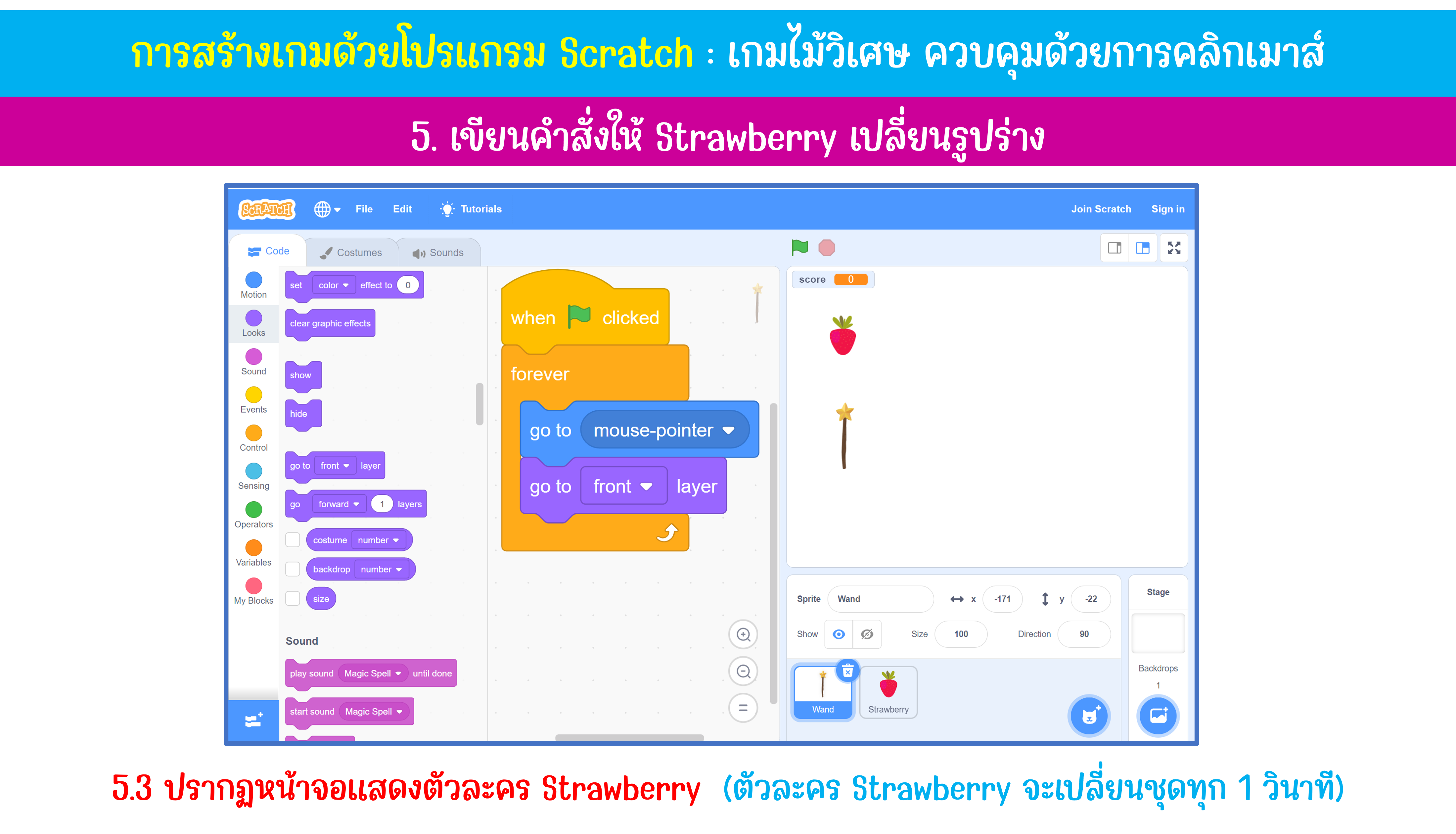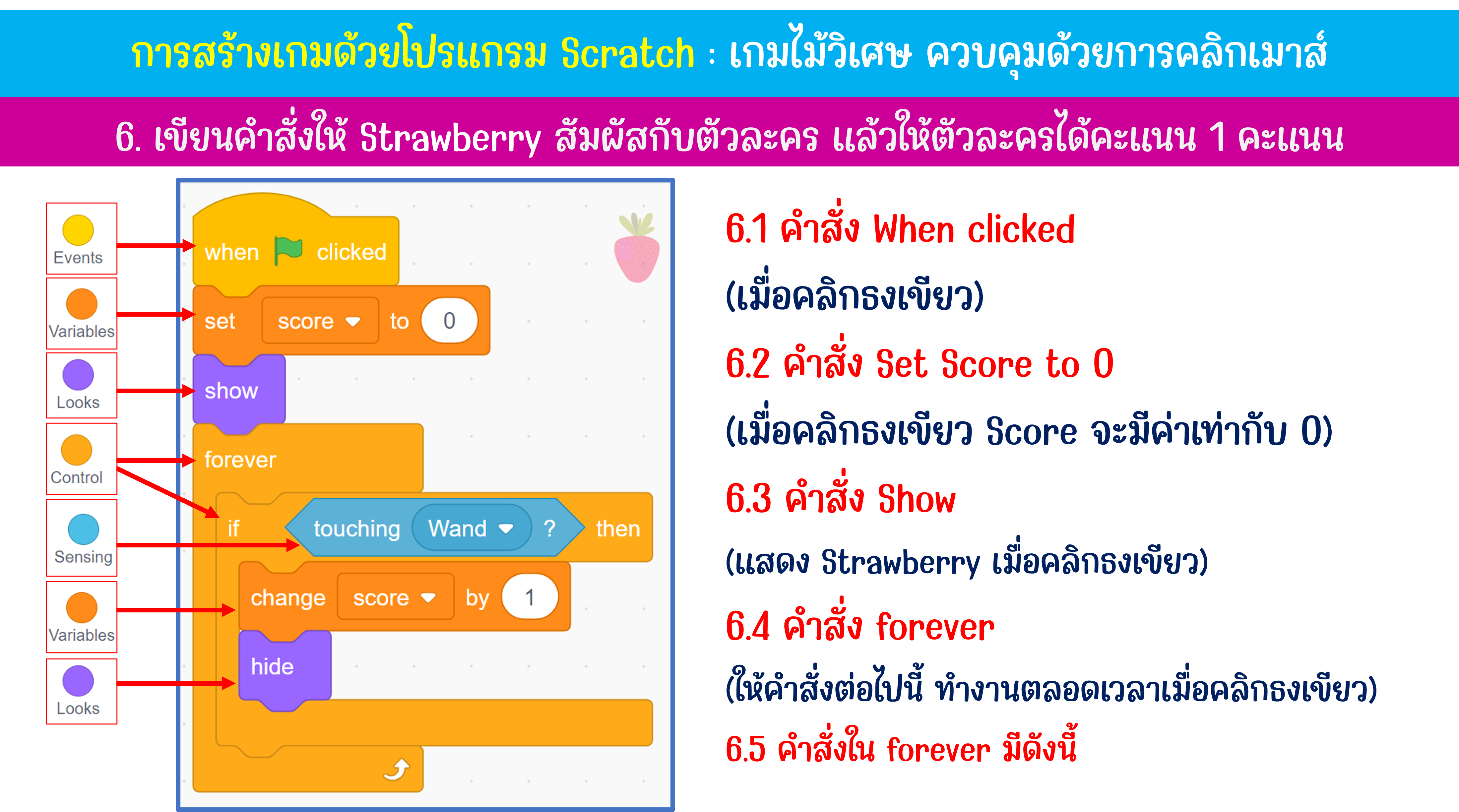 สรุปคำสั่ง ให้ Strawberry เปลี่ยนรูปร่าง (เปลี่ยนชุดถัดไป) และเมื่อเรานำไม้วิเศษไปแตะที่ Strawberry เราจะได้ 1 คะแนน แล้ว Strawberry จะหายไป