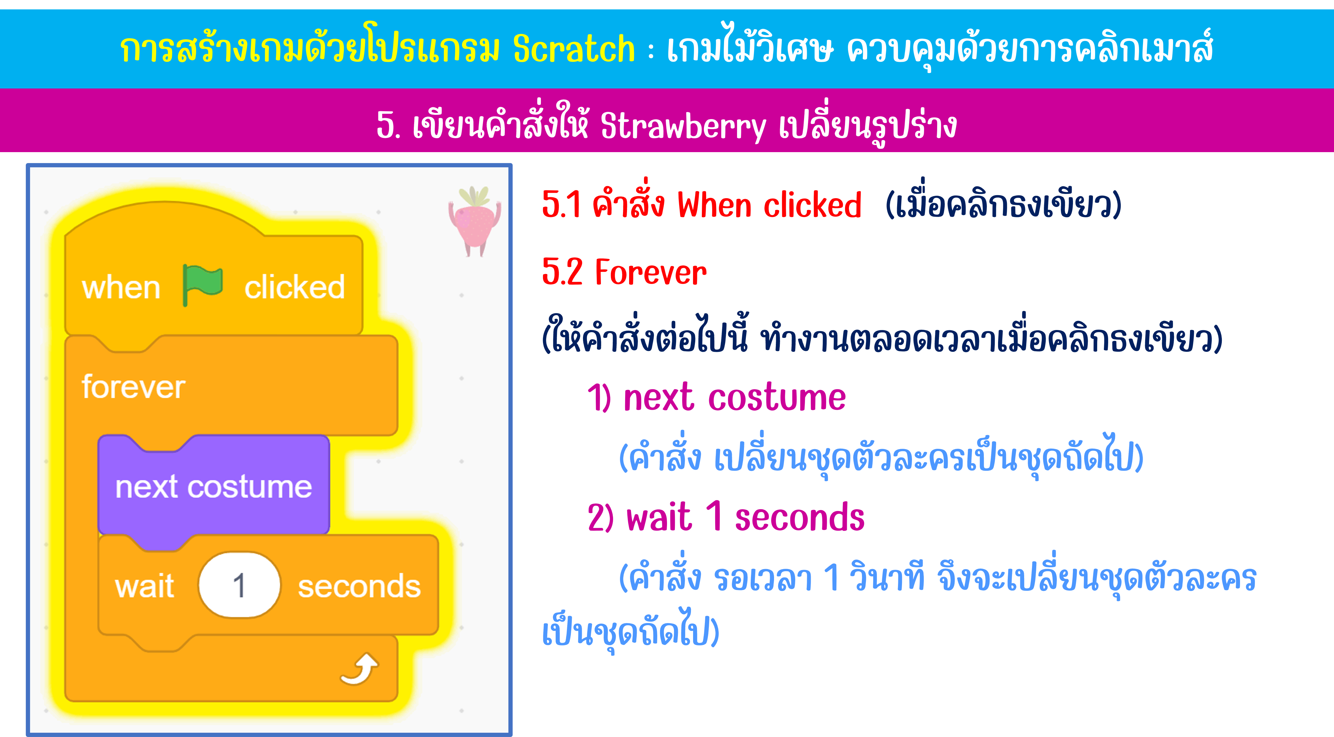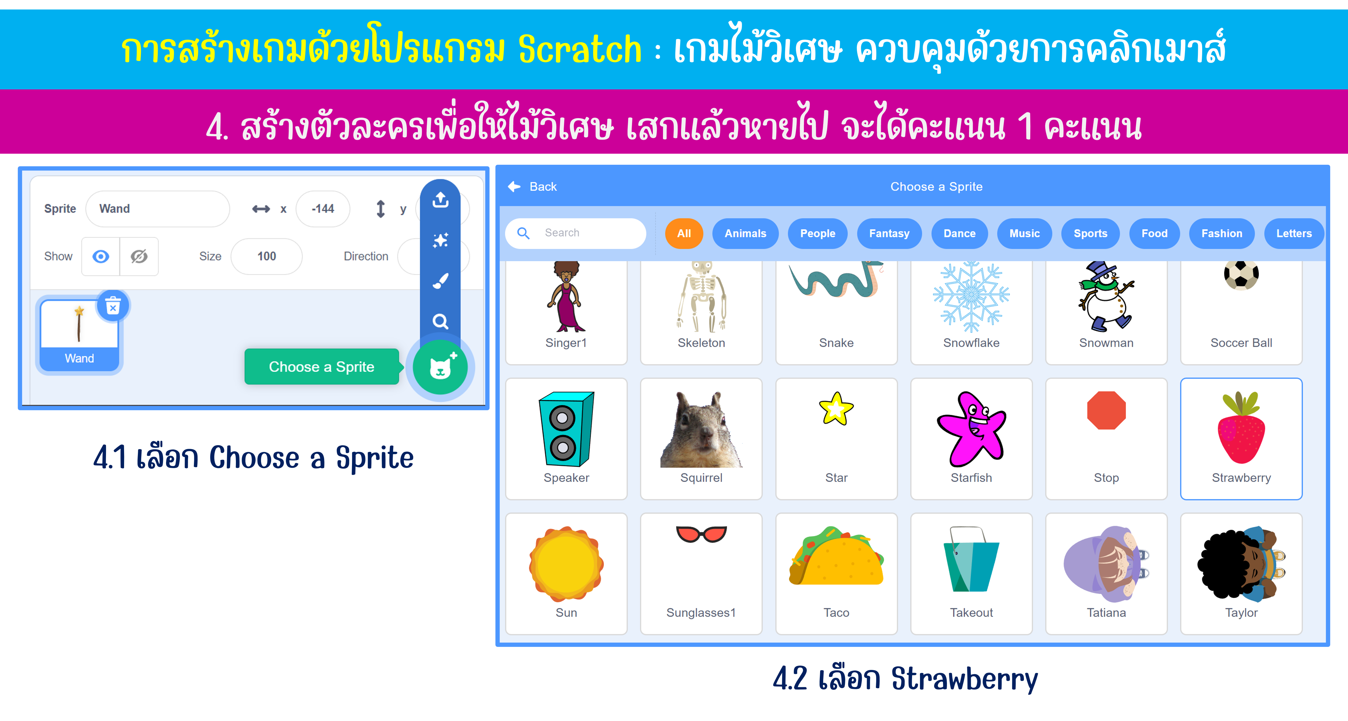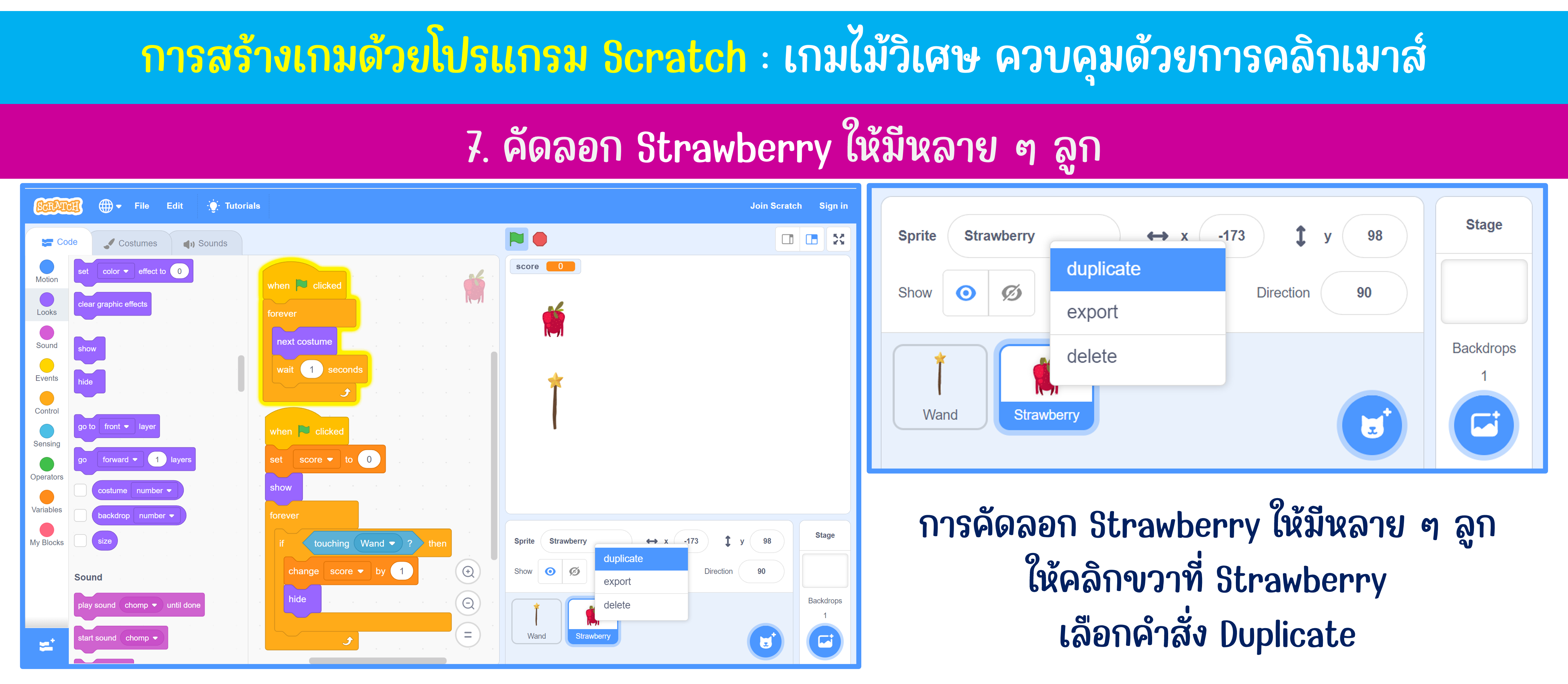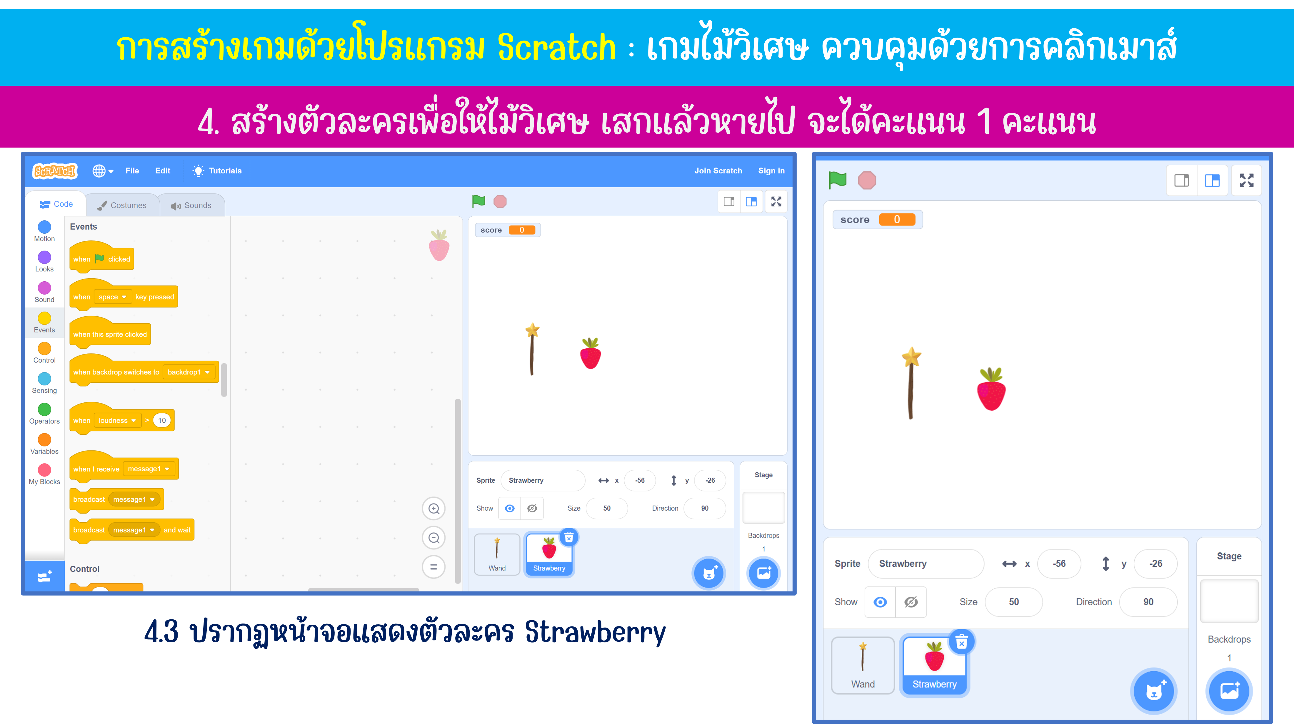 สรุปคำสั่ง ให้ Strawberry เปลี่ยนรูปร่าง (เปลี่ยนชุดถัดไป) และเมื่อเรานำไม้วิเศษไปแตะที่ Strawberry เราจะได้ 1 คะแนน แล้ว Strawberry จะหายไป