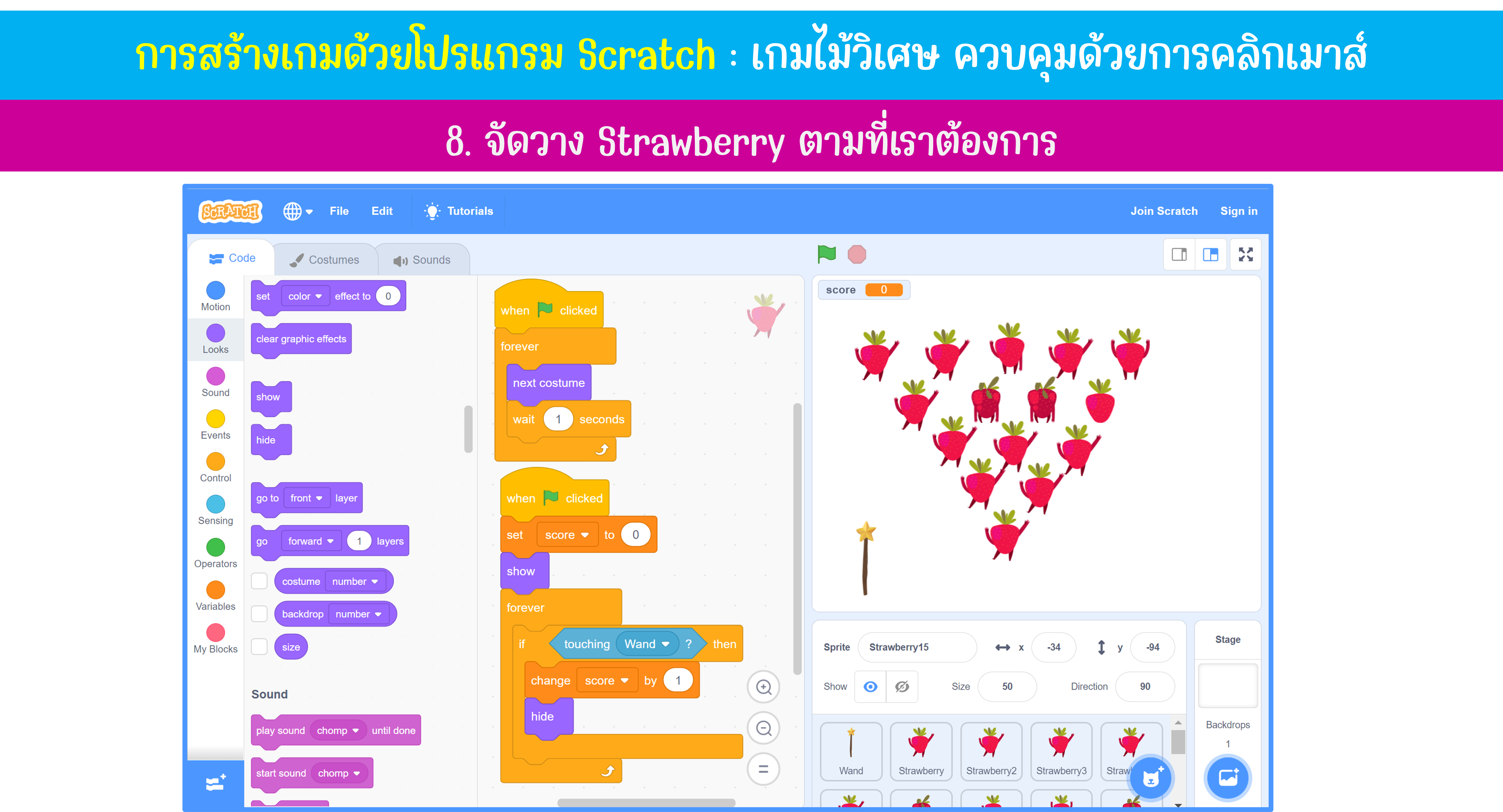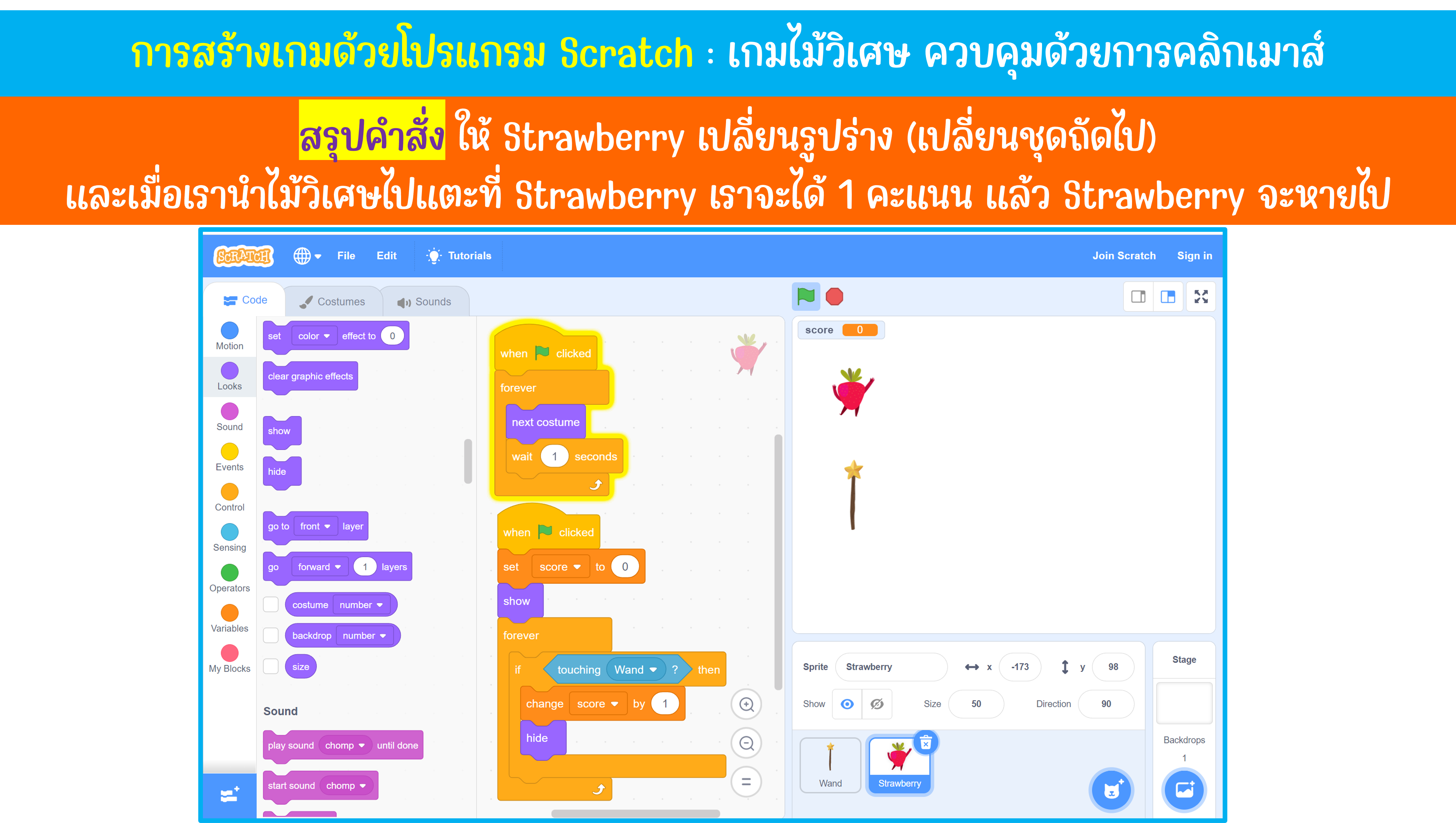 - เขียนคำสั่งให้ Strawberry สัมผัสกับตัวละคร แล้วให้ตัวละครได้คะแนน 1 คะแนน