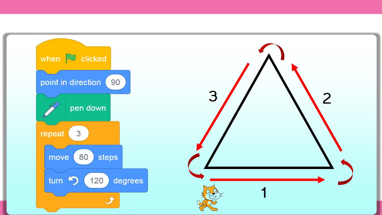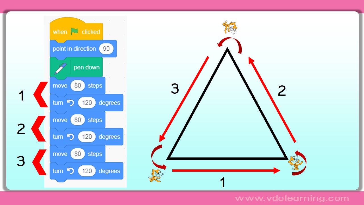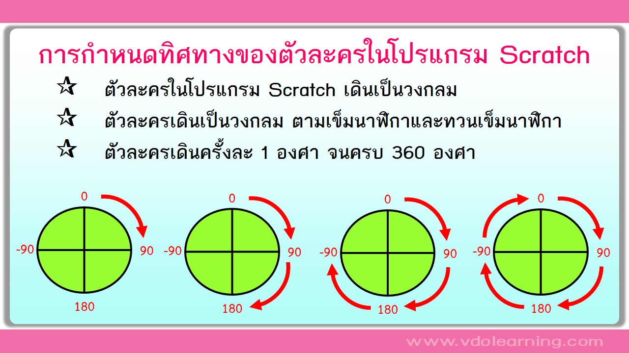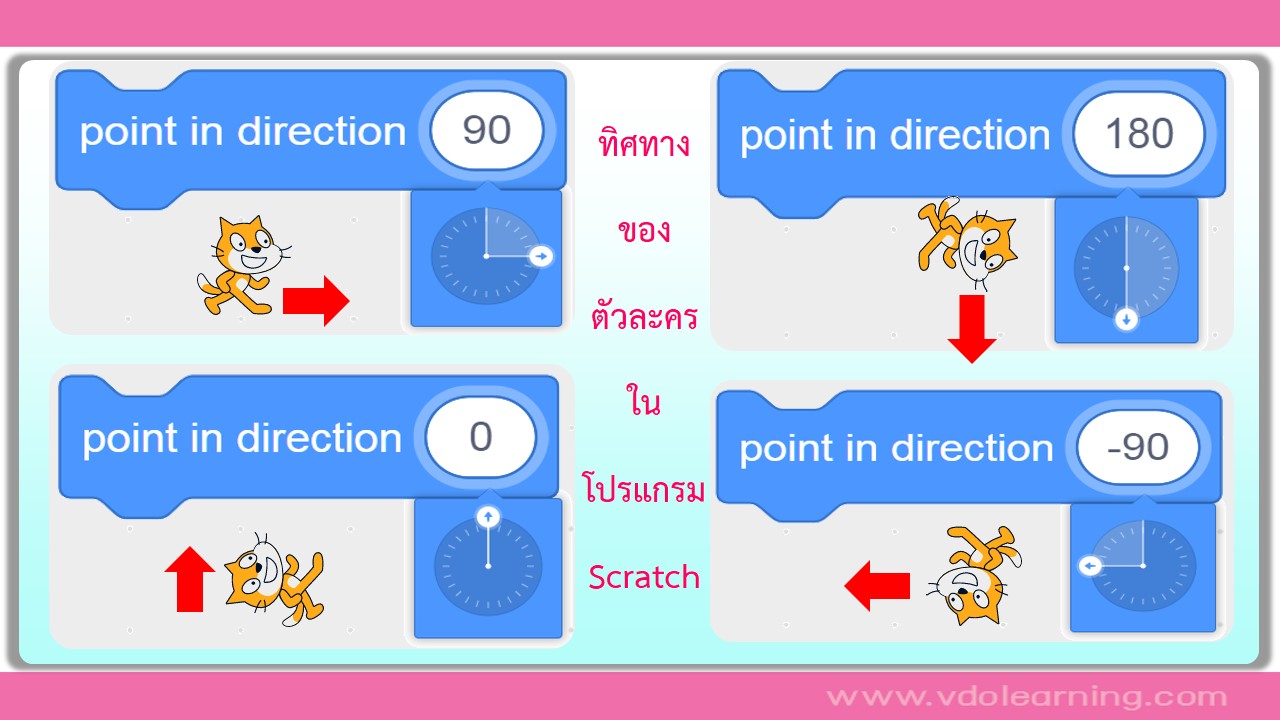 วาดรูปเรขาคณิต ตามทิศทาง Point in direction ด้วยโปรแกรม Scratch มีความสำคัญมาก เนื่องจากก่อนที่นักเรียนจะวาดภาพรูปเรขาคณิตนักเรียนต้องกำหนดทิศทางให้ตัวละครทำการลากเส้นว่าจะลากเส้นไปทางซ้ายหรือทางขวา ลากเส้นขึ้นข้างบน หรือลากเส้นลงข้างลาก เพราะการกำหนดทิศทางในการวาดจะทำให้ผลลัพธ์ของรูปภาพออกมาแตกต่างกัน ในการกำหนดทิศทางให้ตัวละครเราจะสามารถกำหนดได้ ดังนี้