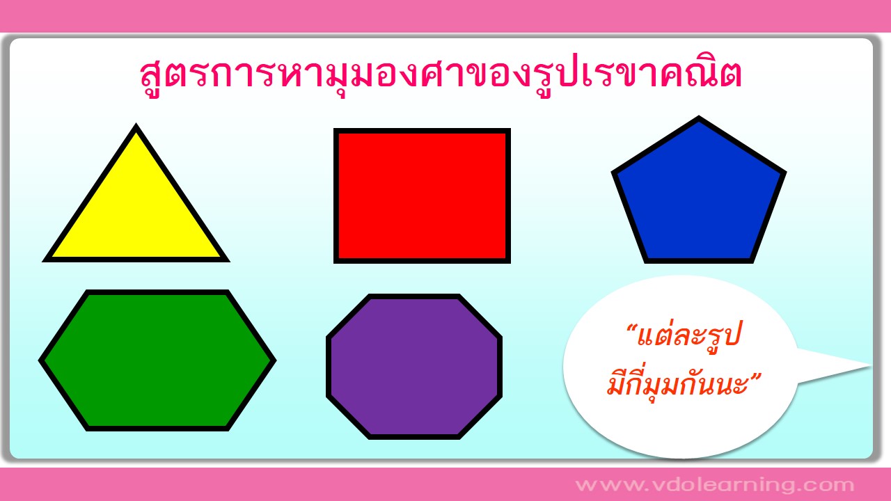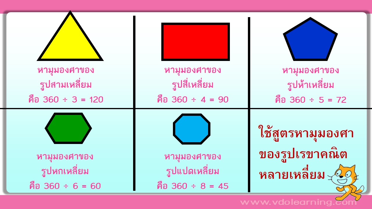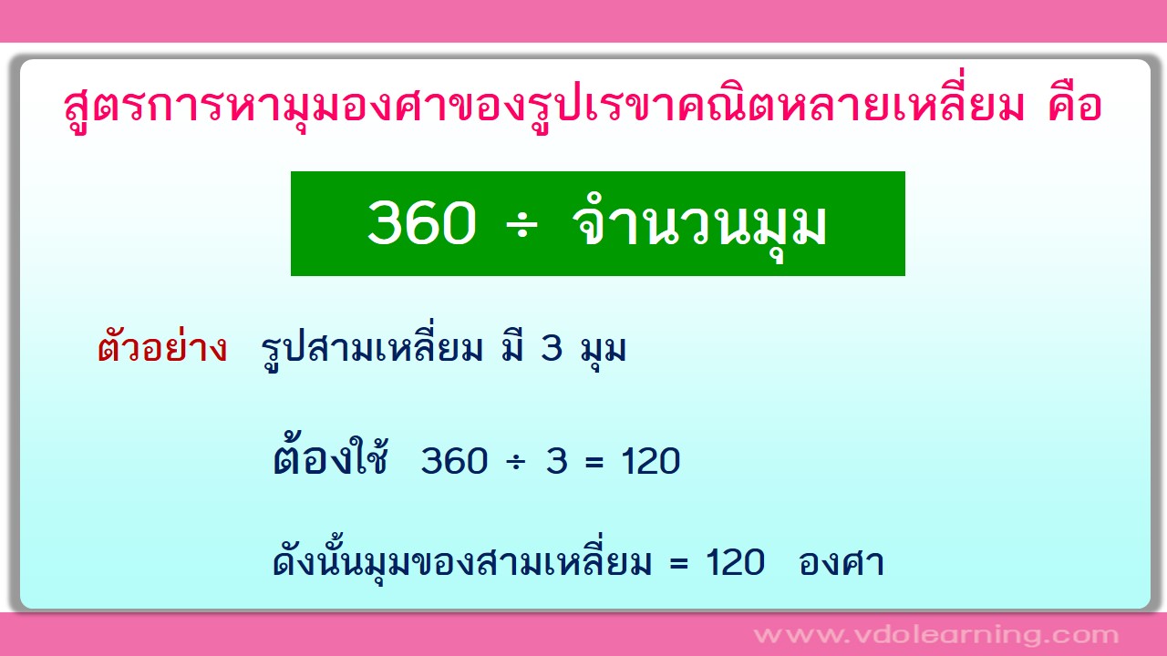 สูตรการหามุมองศาของรูปเรขาคณิตหลายเหลี่ยม คือ 360 หาร จำนวนมุม