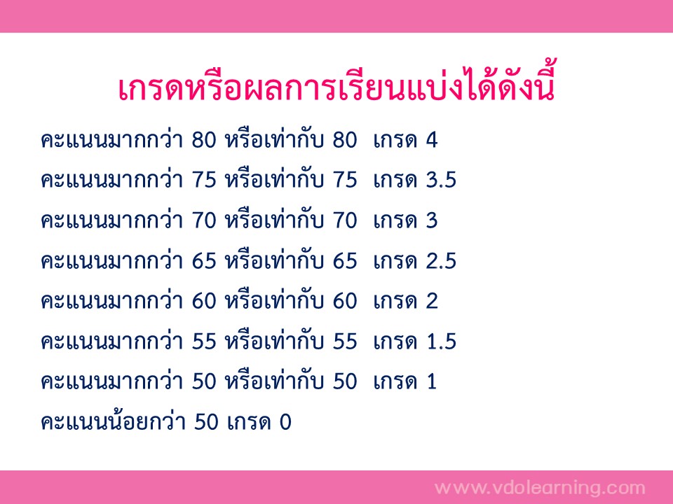 1. นักเรียนต้องรู้ว่าเกรดแต่ละระดับมีค่าคะแนนเท่าไหร่