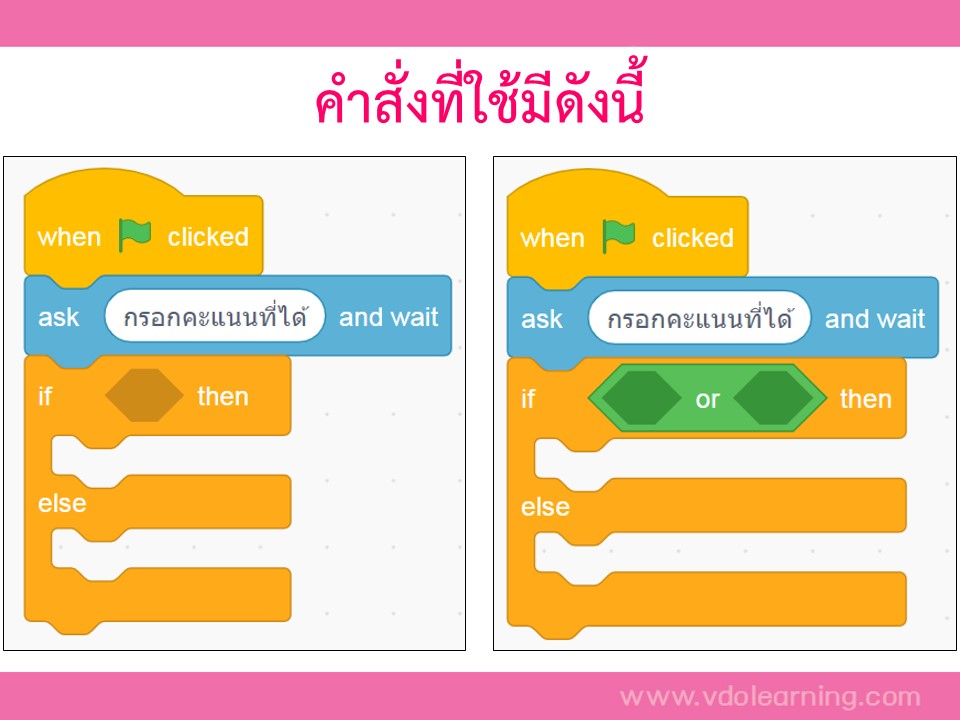 4. ตัวดำเนินการแรก เราใช้บล็อกคำสั่ง or แปลว่า หรือ ซึ่งเป็นตัวดำเนินการทางเลือกให้ผู้กรอกคะแนน