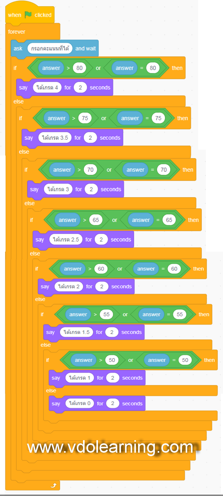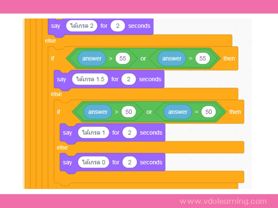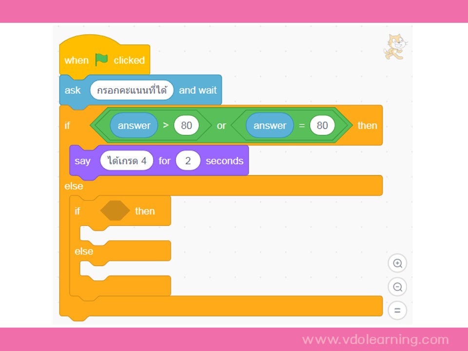 9. ในคำสั่ง else หมายความว่า ถ้าตัวเลขที่เรากรอกไม่ได้มีค่ามากกว่า 80 หรือเท่ากับ 80 ให้ทำการวิเคราะห์คะแนนต่อไป ดังนั้นเราจึงต้องนำบล็อกคำสั่ง if...else มาวางซ้อนในคำสั่ง else เพื่อให้โปรแกรมหาค่าเกรดต่อไป