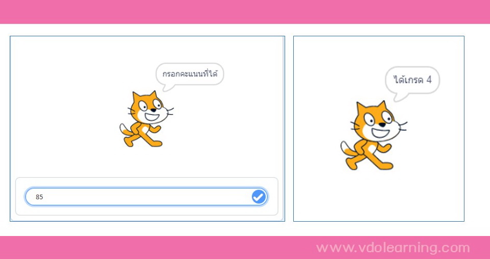 ความเหมายคือ answer เป็นคำตอบ หรือค่าตัวเลขที่เรากรอก เมื่อคำตอบหรือค่าตัวเลขที่เรากรอก มีค่ามากกว่า 80 หรือ เท่ากับ 80 ตัวละครจะพูดคำว่า ได้เกรด 4 เป็นเวลา 2 วินาที
