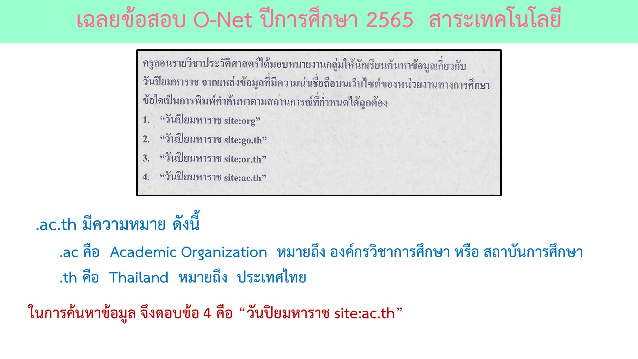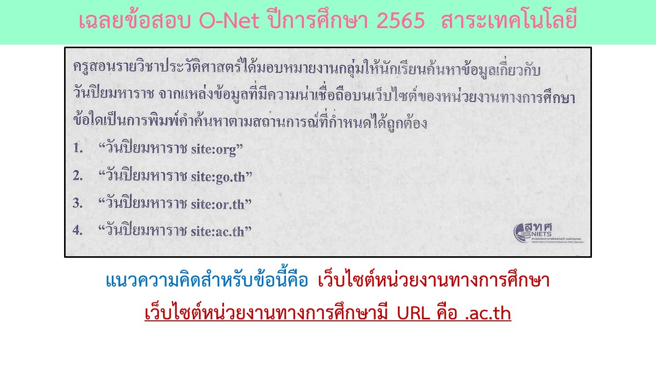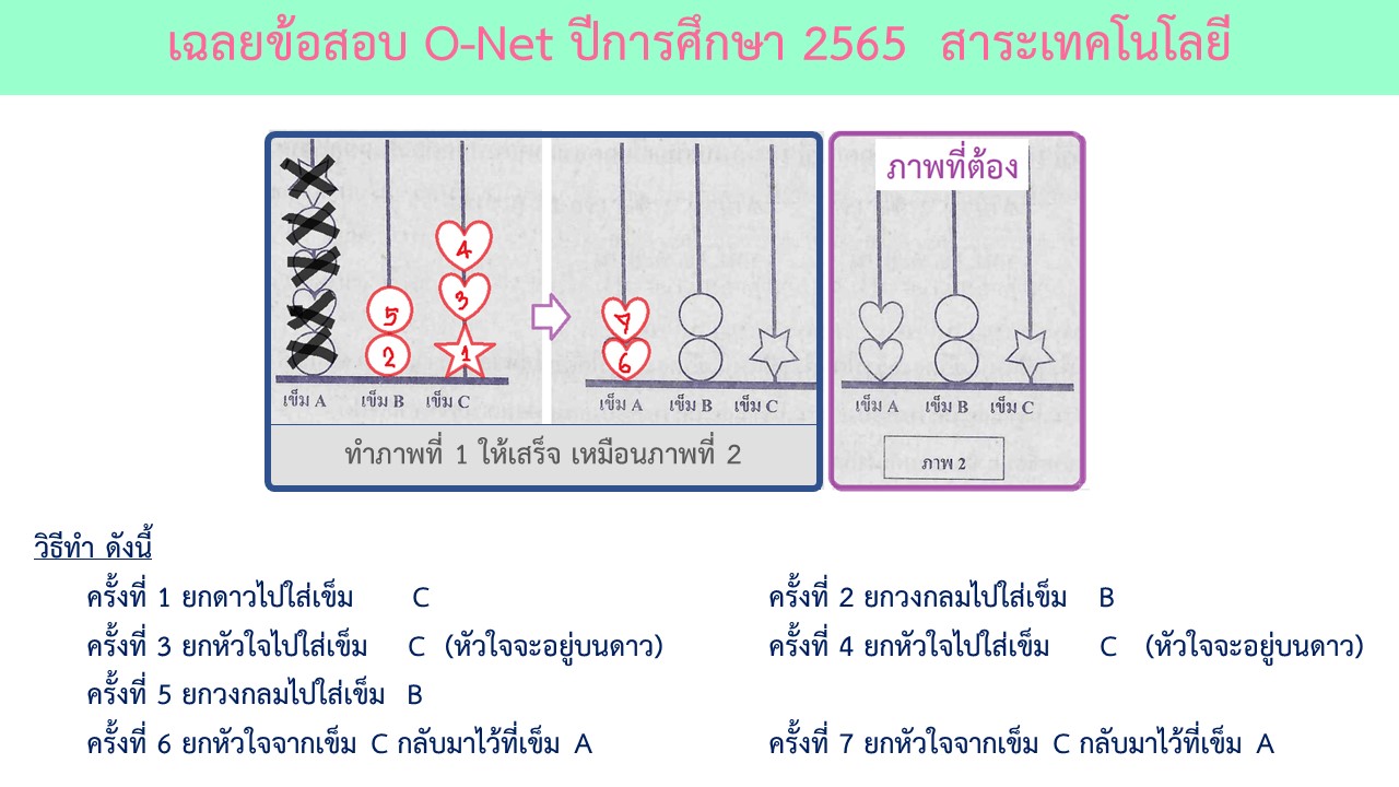 ข้อสอบ O-Net ปีการศึกษา 2565 วิชาวิทยาศาสตร์ สาระเทคโนโลยี ออกจำนวน 2 ข้อ ได้แก่เรื่องตรรกะ การคิดวิเคราะห์อย่างสมเหตุสมผล โดยการเรียงลำดับการยกลูกปัดให้เหมือนกับผลลัพธ์ที่ต้องการ และเรื่องของการใช้เทคโนโลยีอย่างปลอดภัยโดยการค้นหาข้อมูลจากเว็บไซต์การศึกษาซึ่งผลการค้นหาต้องมี URL ที่เป็นหน่วยงานการศึกษา โดยรายละเอียดของข้อสอบมีดังนี้