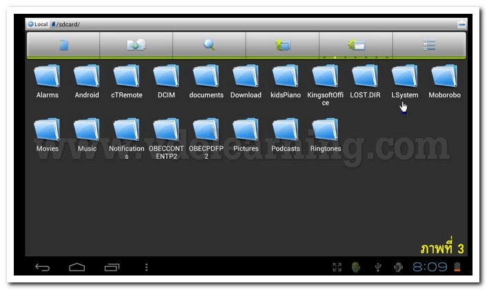 3. แตะโฟล์เดอร์ LSystem ค้างไว้เพื่อทำการลบ (โฟล์เดอร์ LSystem เป็นโฟล์เดอร์ที่เก็บไฟล์ของสื่อการสอนชั้น ป.1 สาเหตุที่เราต้องลบเพราะเนื่องจากหน่วยความจำในเครื่องแท็บเล็ตไม่เพียงพอ ที่จะรองรับไฟล์ข้อมูลของสื่อการสอนชั้น ป.2 ที่มีขนาดไฟล์จำนวนมาก เราจึงจำเป็นต้องทำการลบ ข้อมูลของสื่อการสอนชั้น ป.1 ออกเสียก่อน)